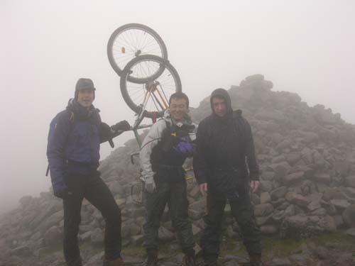 3 gentlemen and two dogs joined this final attack. After having a camera interview with BBC One, we climbed in a deep mist and an occasional rain. It was a very long walk for a man carrying a bike (3 hours) and last part of it was steep enough. However, thanks to the gentlemen and established track, we reached to the summit locally called "nipple". Left of me is Rogger, country manager for Lowe Alpine in Ireland who provided me with new excellent clothings. Right is Eddie from Dungloe (Read more about him on the next photo).