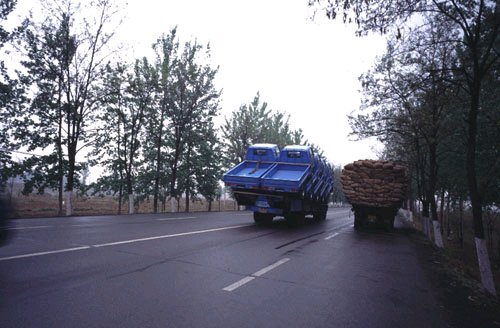 The trucks overtaking me were filled to overflowing. This was true generally in China, but these were hugely overloaded with bricks, and sacks full of grain. The domino effect could easily topple the lot. I was both surprised and terrified at how the trucks carried their loads without dropping them. (from "Against the Wind" - Poolbeg Press)