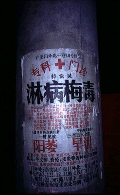 Adverts for "Sex clinic" on a pole in Beijiing.