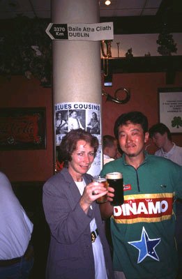 The Guinness I had at the Shamrock Irish pub I went to later with Colin and Kay was twice as nice as the Guinness in Novosibirsk and four times as delicious as the Guinness in Osaka. The head was much, much finer. A road sign in the bar said ‘Dublin 3,370km’. (from "Against the Wind" - Poolbeg Press)