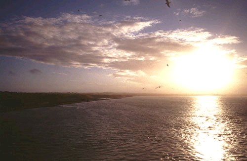 golden evening sunlight. A big flock of seagulls flew around