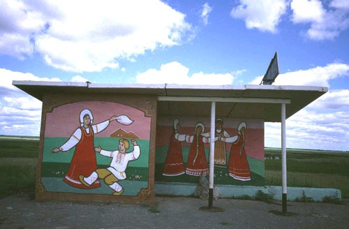 Russian bus stops are great. They are painted in bright patterns and liven up otherwise dull scenery. Inevitably, perhaps I looked forward to seeing these bus stops that appeared at intervals of about 20 or 30 kilometres. The real masterpiece was an illustration of a family doing a Cossack dance. The earth was green, but the sky was a shocking pink! (from "Against the Wind" - Poolbeg Press)